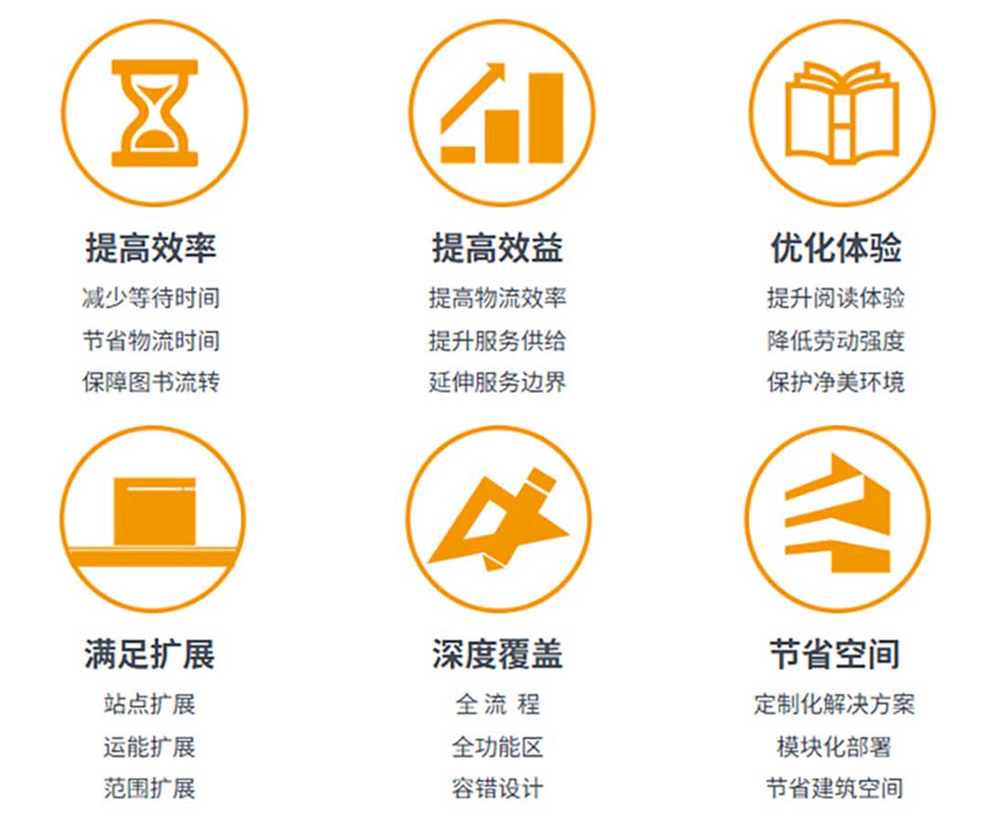 · 连续传输效率>1800本/小时,运力灵活扩容满足读者数量激增带来的图书流通压力。还可以深度对接图书管理系统,更大限度发挥集群整合与协同管理优势。